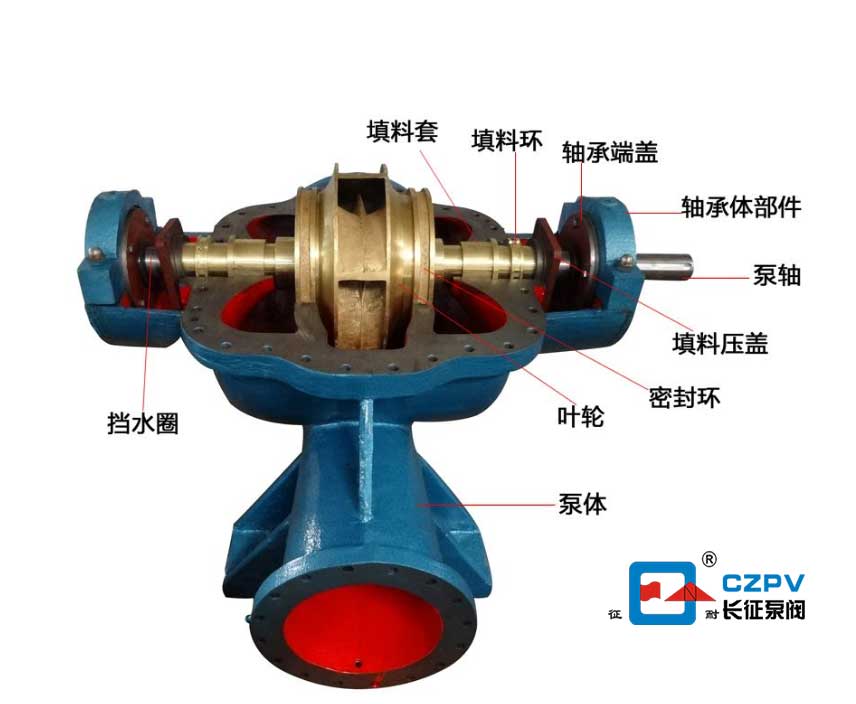雙吸泵軸由兩個(gè)單列向心球軸承支撐。軸承安裝在泵體兩端的軸承體中,并用黃油潤(rùn)滑。雙吸密封環(huán)用于減少水從泵的加壓水腔室到吸入腔室的泄漏。水泵由電動(dòng)機(jī)通過聯(lián)軸器直接驅(qū)動(dòng)。軸封是軟填料密封。為了冷卻和潤(rùn)滑密封腔并防止空氣泄漏到泵中,填料之間有一個(gè)水密封環(huán)。泵工作時(shí),少量高壓水通過水封管流入加注腔,起到水封的作用。這種類型的泵的主要組件是:泵體,泵蓋,葉輪,軸,雙吸力密封圈,軸套,軸承等。除軸材料為優(yōu)質(zhì)碳鋼外,其余大部分均由以下材料制成:鑄鐵。泵體和泵蓋構(gòu)成葉輪的工作室。在入口和出口法蘭上形成用于安裝真空計(jì)和壓力計(jì)的管螺紋孔,在入口和出口法蘭下方設(shè)有用于排水的管螺紋孔。葉輪經(jīng)過靜平衡驗(yàn)證,并在兩側(cè)固定有襯套和襯套螺母。它的軸向位置可以通過套筒螺母來調(diào)節(jié)。葉輪的軸向力通過其葉片的對(duì)稱布置來平衡,并且可能還有一些剩余。剩余的軸向力由同軸端的軸承承受。